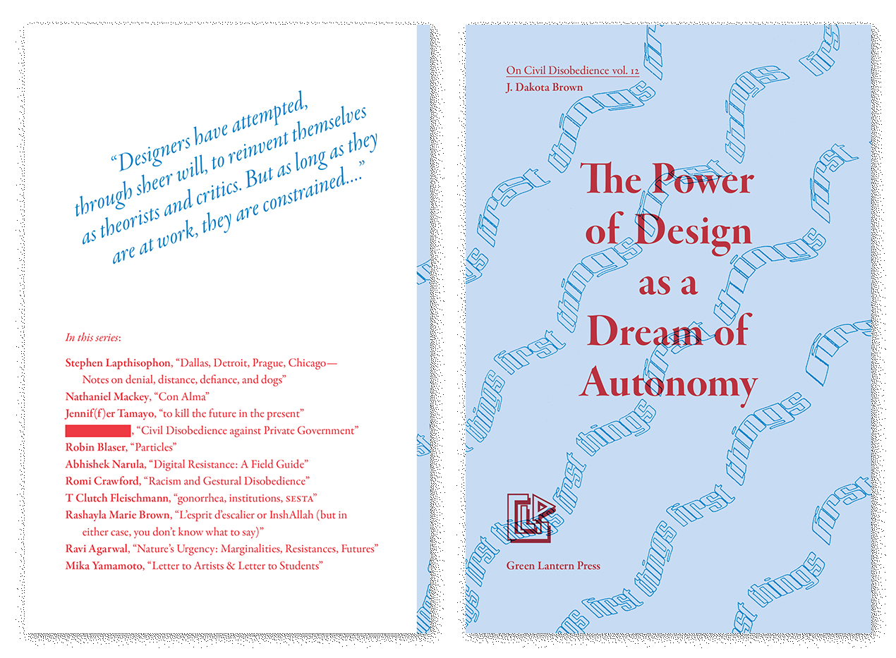 “The Power of Design as a Dream of Autonomy” (2019) was published in two editions of 250 by The Green Lantern Press. The pamphlet was edited by Fulla Abdul-Jabbar and designed by the author. The “First Things First Manifesto 2000” was reprinted by permission of Adbusters.
